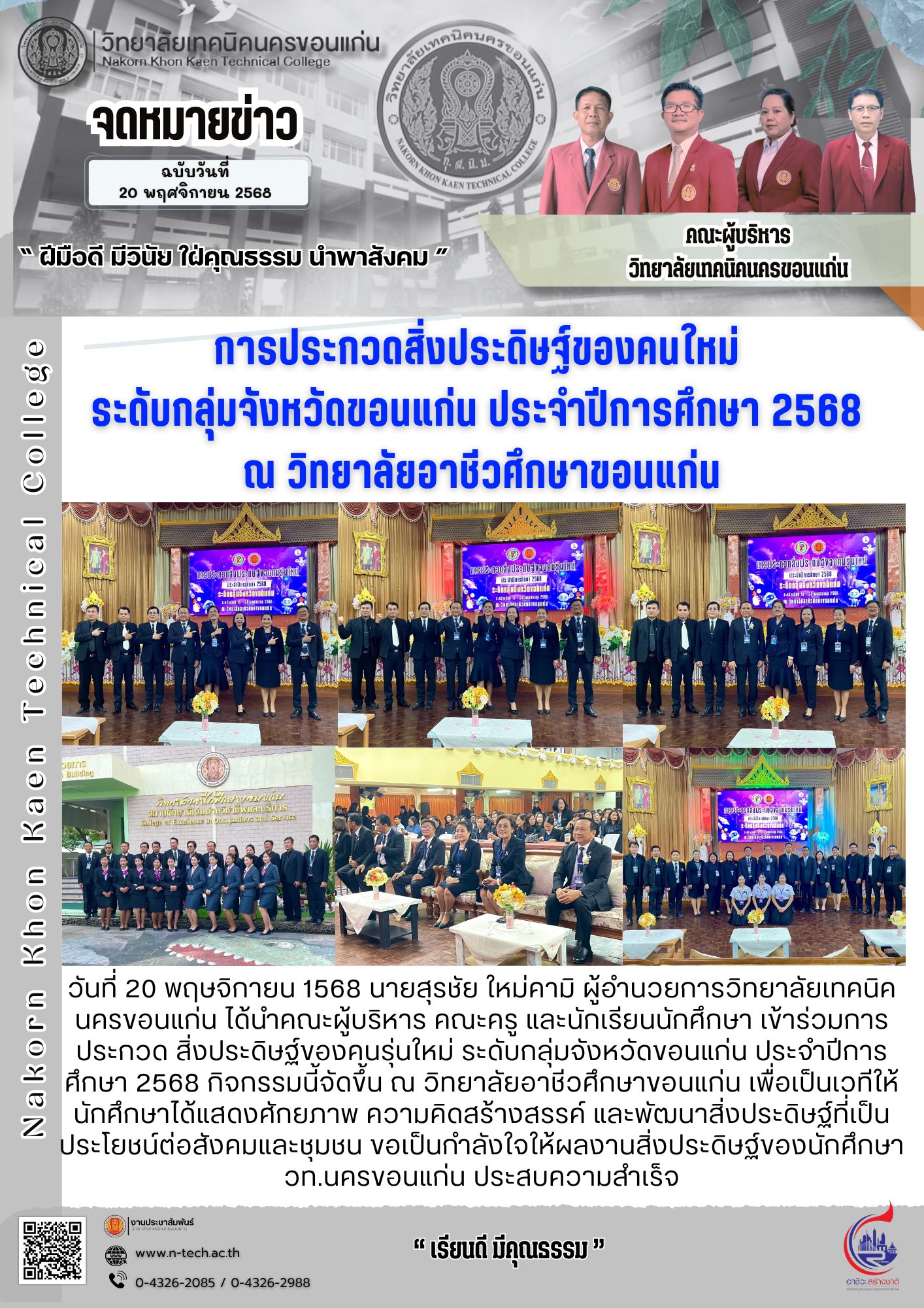 ข่าวประชาสัมพันธ์ นายสุรชัย ใหม่คามิ ผู้อำนวยการวิทยาลัยเทคนิคนครขอนแก่น ได้นำคณะผู้บริหาร คณะครู และนักเรียนนักศึกษา เข้าร่วมการประกวด สิ่งประดิษฐ์ของคนรุ่นใหม่ ระดับกลุ่มจังหวัดขอนแก่น ประจำปีการศึกษา 256820 พฤศจิกายน 202527 พฤศจิกายน 2025